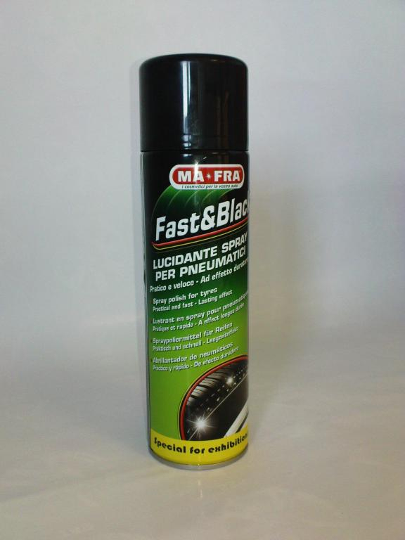 MA-FRA Čistič pneumatík - Fast&Black 500ml. Špeciálny prípravok na pneumatiky. Šikovný a rýchlo pôsobiaci. Dlhotrvajúci účinok špeciálny na výstavy. Prípravok Fast&Black obnovuje pôvodnú farbu pneumatík a ochraňuje ich pred vznikom prasklín a pôsobením atmosferických / chemických látok. Prípravok Fast&Black nemaže, nelepí sa a má príjemnú vôňu. Možno ho použiť aj na obnovu gumových rohoží, nárazníkov, spätných zrkadiel, blatnikov a spojlerov. Obsah 500 ml